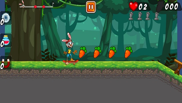 In Bunny Skater, the core objective is to control the skateboarding bunny through the levels and collect all four yellow icons and all the carrots that appear along the way. These items provide short-term advantages, such as attracting surrounding carrots or helping the character quickly recover after a fall. Each level offers a unique experience and obstacle course that you must overcome. The game boasts three distinct skateboarding worlds with a total of 72 levels, offering a long and diverse journey for players to explore.